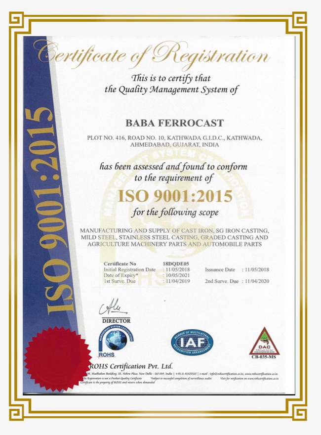 Baba Ferrocast incorporated in the year 2009, at Ahmedabad (Gujarat, India),we are widely acknowledged for Molders of C.I,,S.G.I, M.S, graded casting & Machinery Parts manufacturing, exporting and supplying a comprehensive assortment of Agriculture Machinery Spare Parts, Round Gear Box, Industrial Products, Handle, Drip Irrigation Part, etc. " It is our mission to manufacture quality ferrous castings with maintaining the lowest delivery schedles and continuous imporvement is our aim". We are also committed towards building a safe and healthy environment through effective implementation and continual improvement of the management systems. Our Goals A People - We would focus on improving efficiency of people by regular on and off the job training. We will also maintain a harmonious environment for people to flourish beyond their belief and Constant research and close tie–ups with market operators will help us in developing new and improved products.